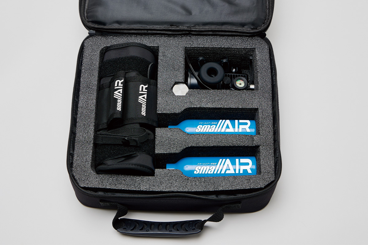 「コンプリートセット」は、さまざまなシーンで活躍するスモールエアーの魅力を詰め込みました!手動ポンプを使用して簡単に空気を充填できるため、気軽にプチダイビングを楽しむことができます。また、専用キャリーバッグに収納すれば、持ち運びも楽々。
