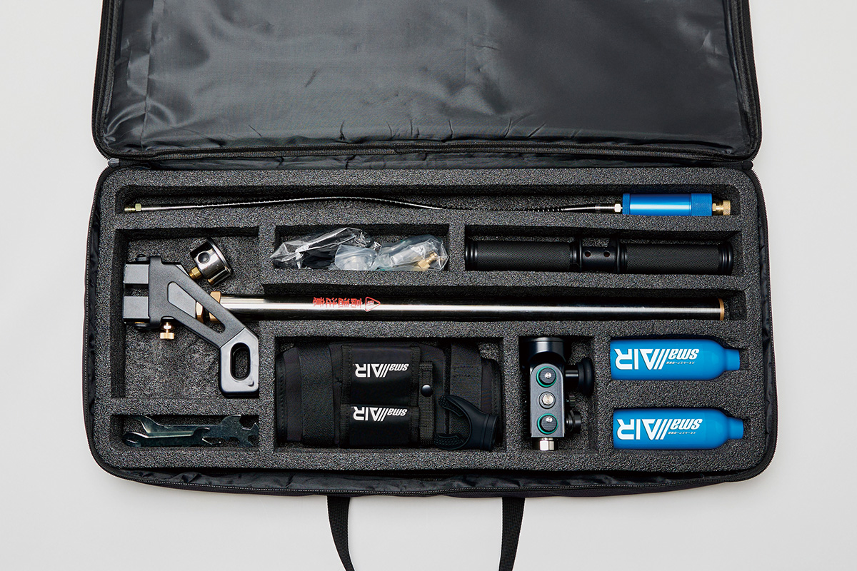 コンプリートセット付属の手動ポンプ、別売りの専用コンプレッサーを使い再充填をすることで、繰り返し使用ができます。200気圧でボンベ1本あたり5分でフル充填。